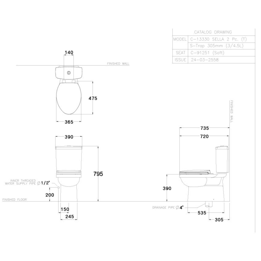Bản vẽ Bồn Cầu Hai Khối COTTO C13330 Dòng Sella Nắp Đóng Êm