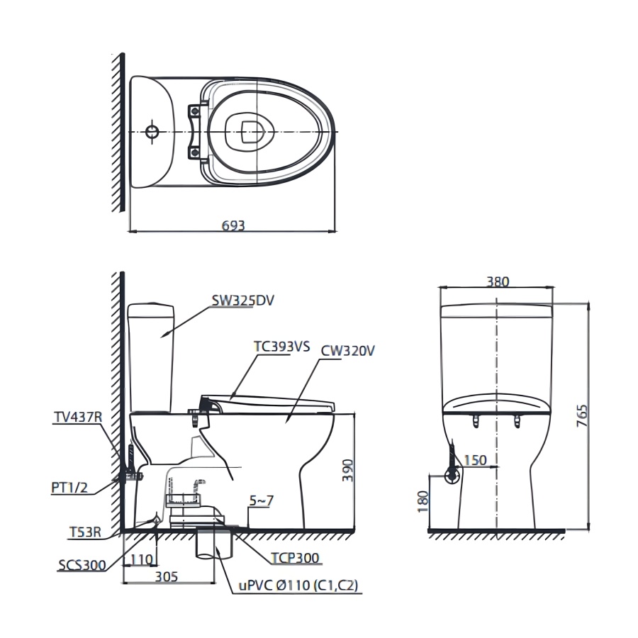 Bản vẽ Bồn Cầu Hai Khối TOTO CS325DRT2 Nắp TC393VS