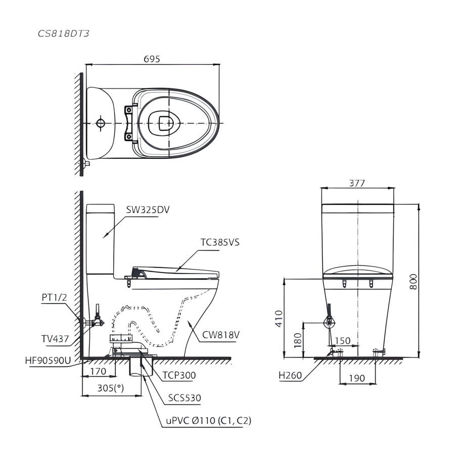 Cấu tạo gồm: Thân cầu C818, két nước S818D, nắp bồn cầu TC385VS (nắp đóng êm)