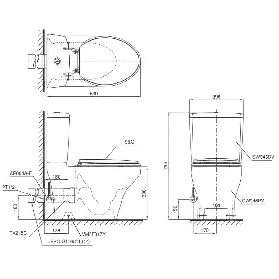 Cấu tạo: Thân cầu C945P, Két nước S945D, Nắp TC395VS