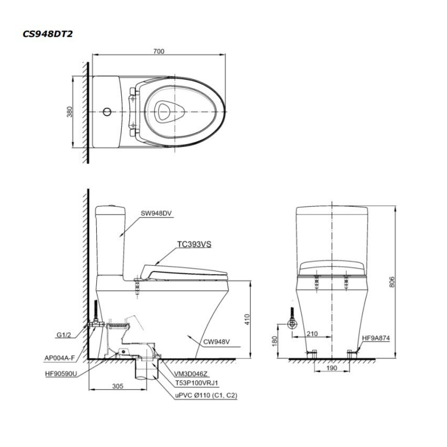 Bản vẽ Bồn Cầu Hai Khối TOTO CS948DT2 Nắp Đóng Êm TC393VS