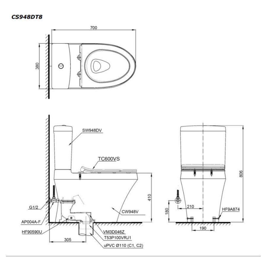 Dưới đây là thông số kỹ thuật chi tiết của bồn cầu 2 khối TOTO CS948DT8#XW và nắp êm TC600VS#W: