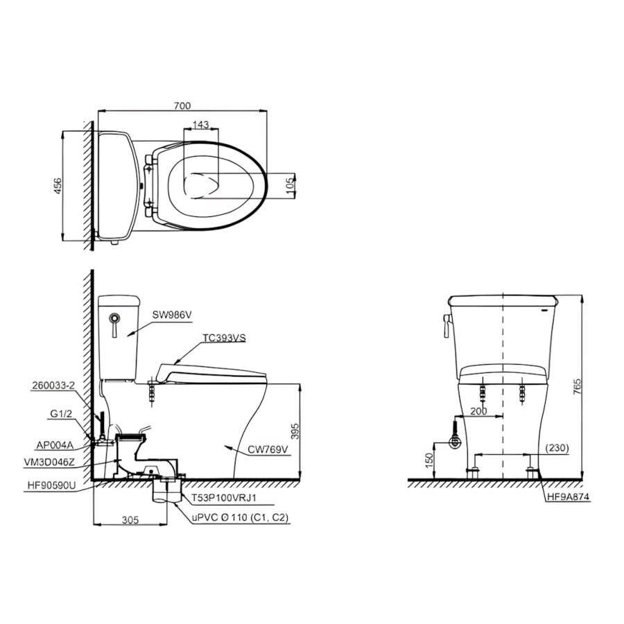 Bản vẽ Bồn Cầu Hai Khối TOTO CS986GT2 Nắp TC393VS