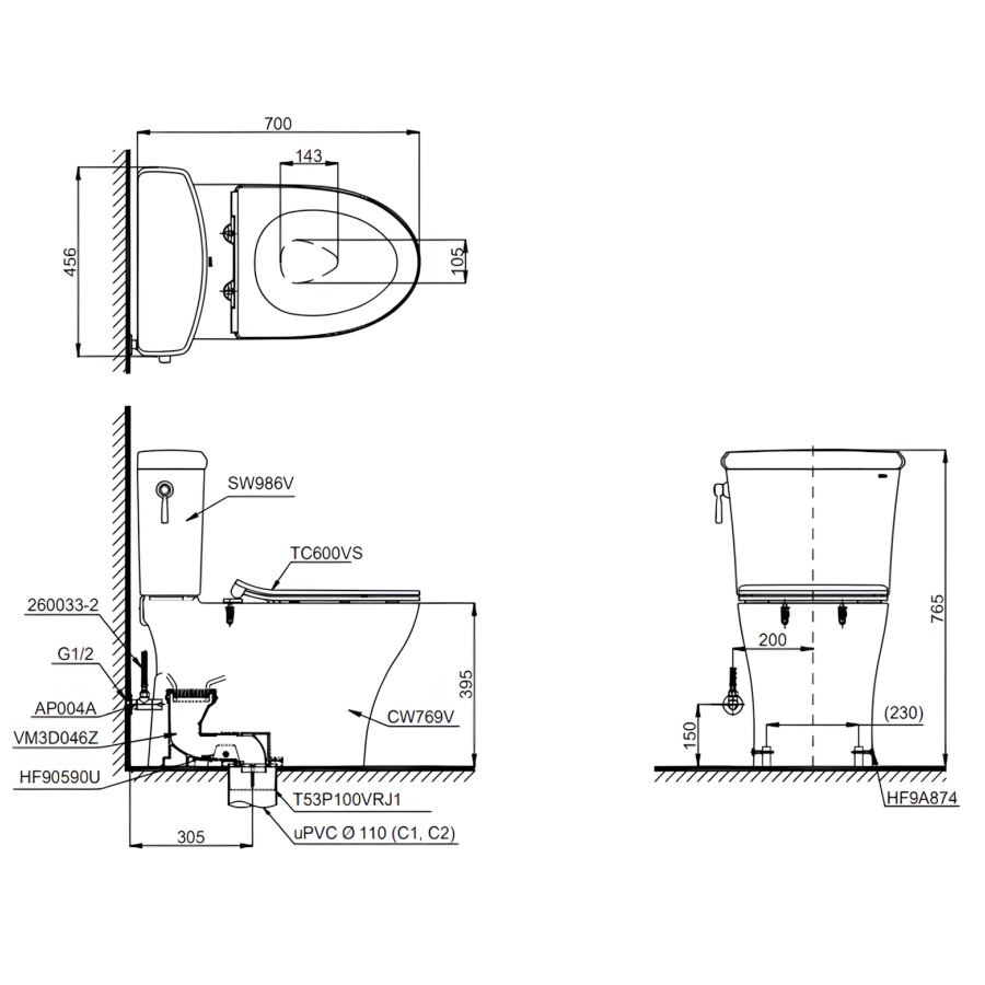 Bản vẽ Bồn Cầu Hai Khối TOTO CS986GT8 Nắp TC600VS