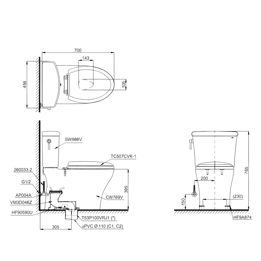 Bản vẽ Bồn Cầu Hai Khối TOTO CS986GT9 Nắp Êm