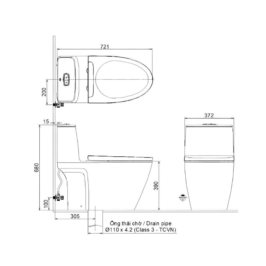 Kích thước bồn cầu (DxRxC): 721 x 372 x 680 mm