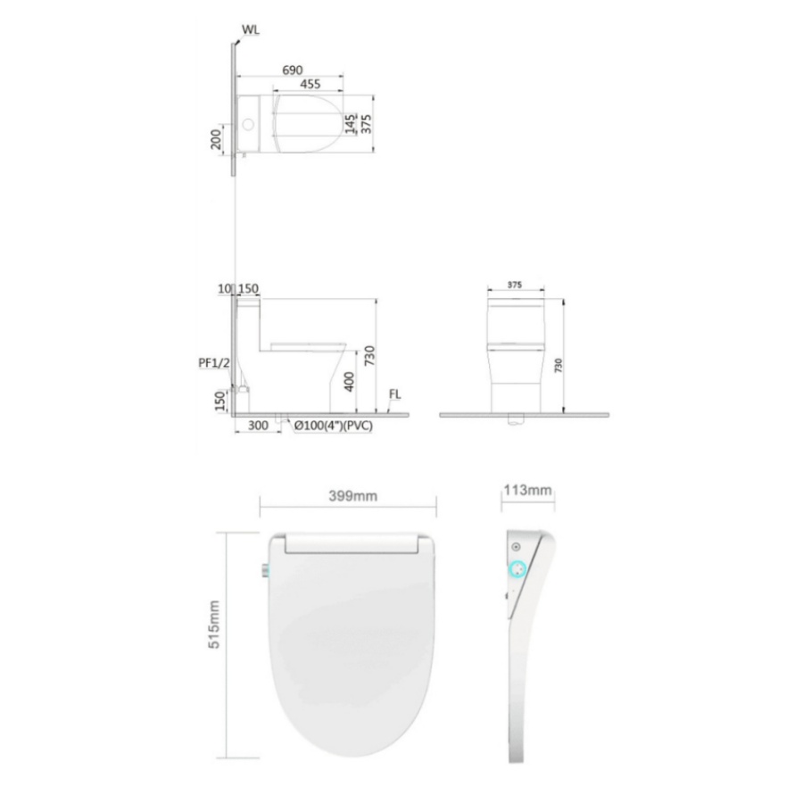 Bản vẽ Bồn Cầu Một Khối Caesar C1374F/TAF512H Nắp Điện Tử
