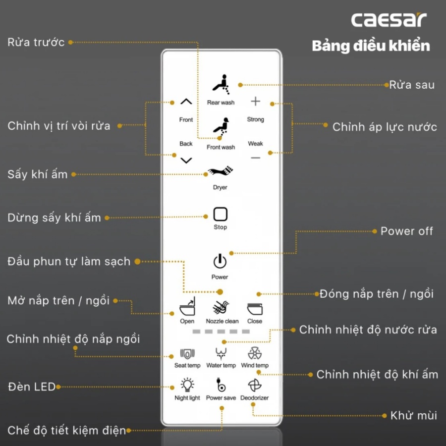 Bồn cầu điện tử Caesar C1375F/TAF710H có remote điều khiển thông minh, thiết kế sang trọng, nhiều chức năng tiện ích, mang đến trải nghiệm vệ sinh hiện đại.