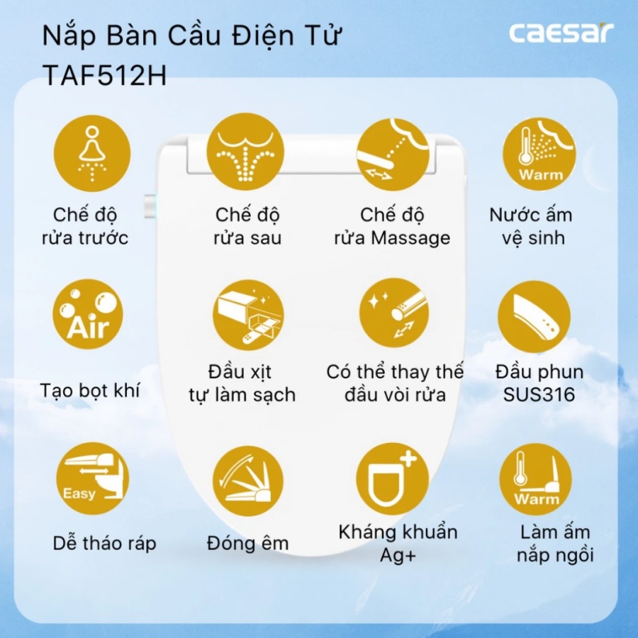 Vệ sinh tự động, chăm sóc sức khỏe: Nắp điện tử TAF512H tích hợp nhiều chế độ rửa tự động, bao gồm chế độ rửa đại tiện và vệ sinh dành riêng cho phụ nữ. Vòi rửa làm từ chất liệu Stainless + ABS, có thể điều chỉnh vị trí và tự làm sạch sau khi dùng, đảm bảo vệ sinh tuyệt đối.