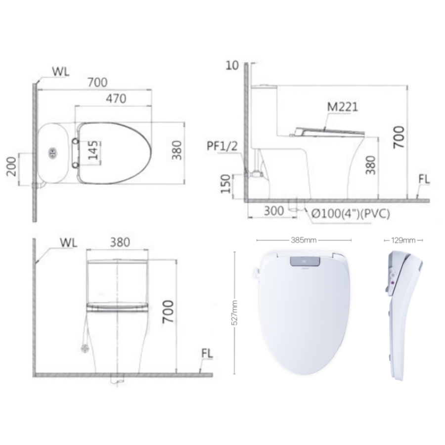 Bản vẽ Bồn Cầu Một Khối Caesar C1395F/TAF610H Nắp Điện Tử