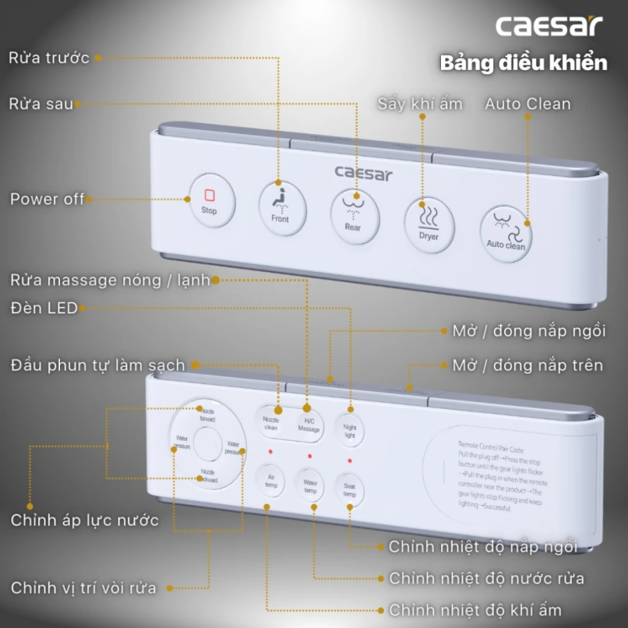 Bồn cầu điện tử CAESAR C1363F/TAF710H có remote, tích hợp nhiều tính năng thông minh, rửa tự động, sưởi ấm, mang lại trải nghiệm tiện nghi.
