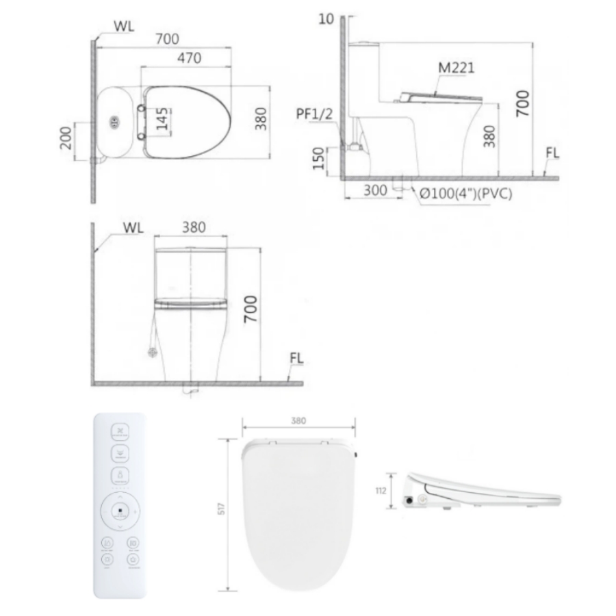 Bản vẽ Bồn Cầu Một Khối Caesar C1395F/TAF710H Nắp Điện Tử