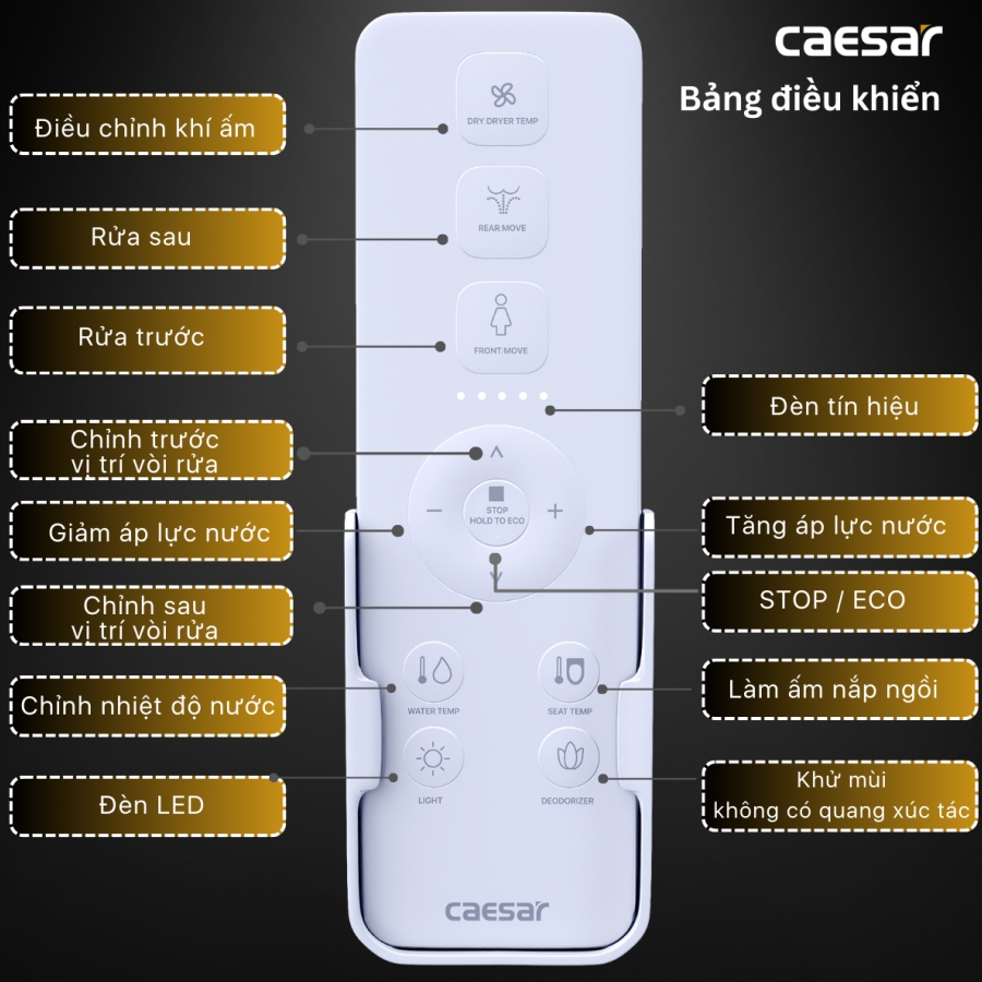 Bồn cầu điện tử CAESAR C1363F/TAF710H có remote, tích hợp nhiều tính năng thông minh, rửa tự động, sưởi ấm, mang lại trải nghiệm tiện nghi.