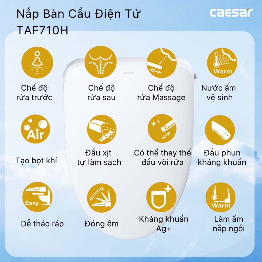 Bồn cầu điện tử CAESAR CD1340/TAF710H có remote, tích hợp nhiều tính năng thông minh, rửa tự động, sưởi ấm, mang lại trải nghiệm vệ sinh hiện đại và tiện ...