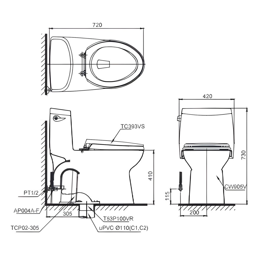 Bản vẽ Bồn Cầu Một Khối TOTO MS905T2#XW Nắp TC393VS