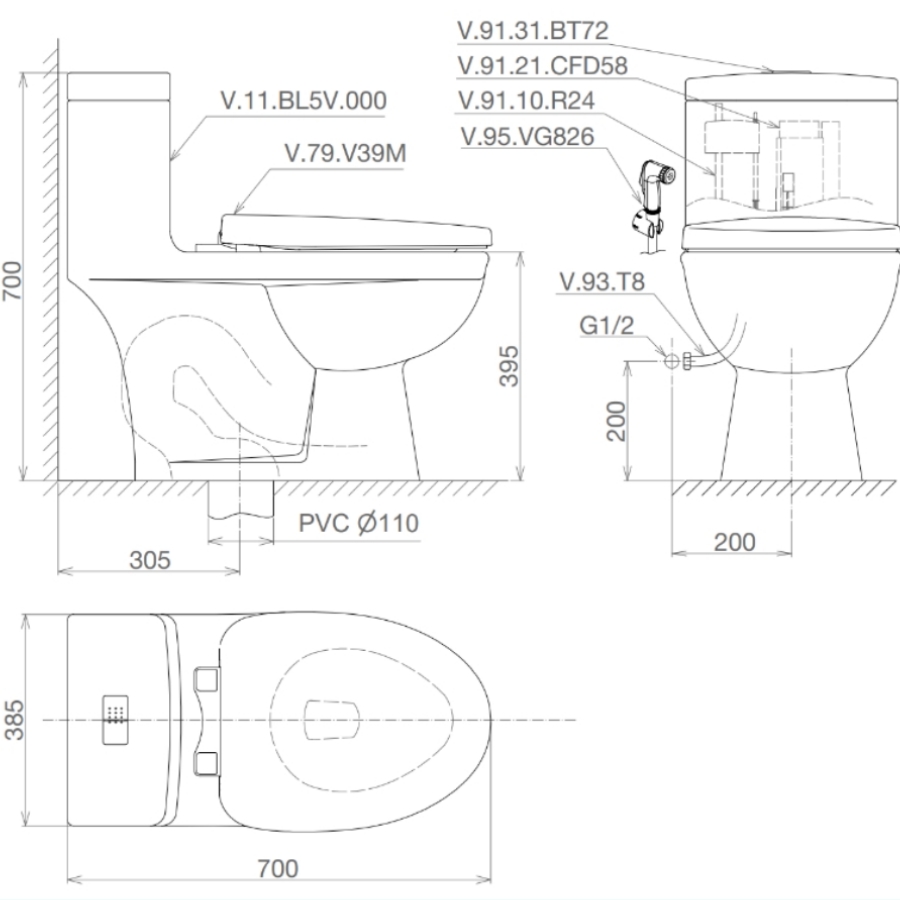 Thiết kế hiện đại, phù hợp với nhiều không gian: Với kích thước 700 x 385 x 700 mm (Dài x Rộng x Cao) và màu sắc trang nhã, bồn cầu một khối Viglacera BL5 dễ dàng lắp đặt và phối hợp với nhiều phong cách phòng tắm, từ cổ điển đến hiện đại. Nắp bồn cầu rơi êm V37 đi kèm giúp tránh va đập mạnh, kéo dài tuổi thọ sản phẩm.