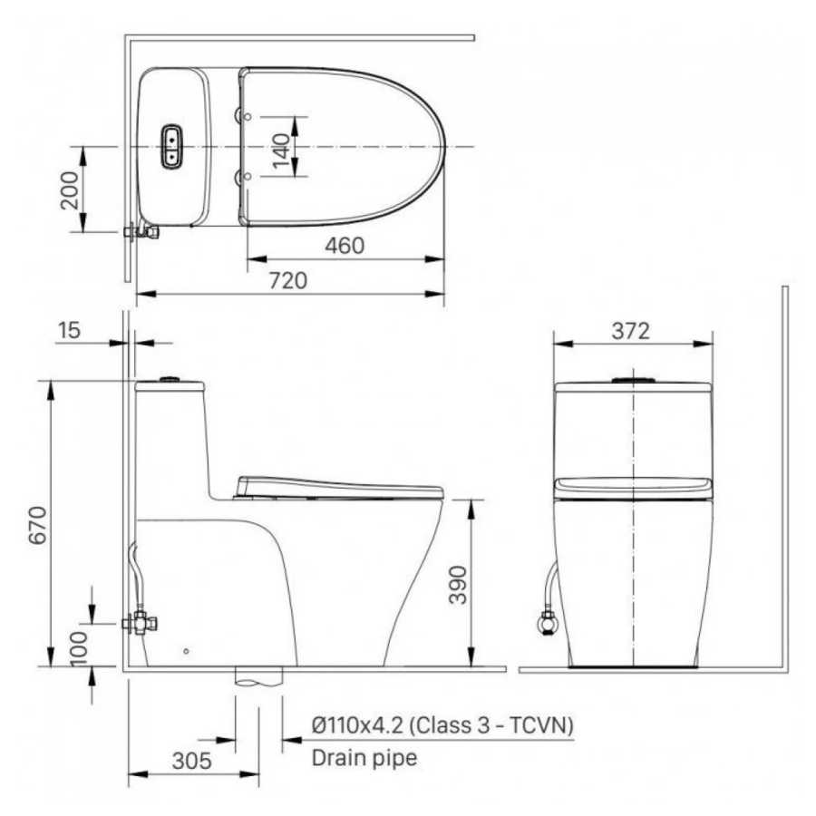 Kích thước bồn cầu (DxRxC): 720 x 372 x 670 mm