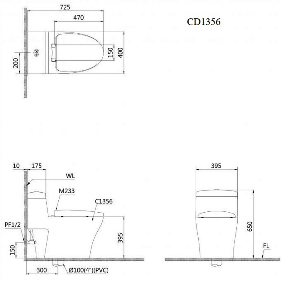 Bản vẽ bồn cầu Caesar C1356F + nắp cơ TAF060