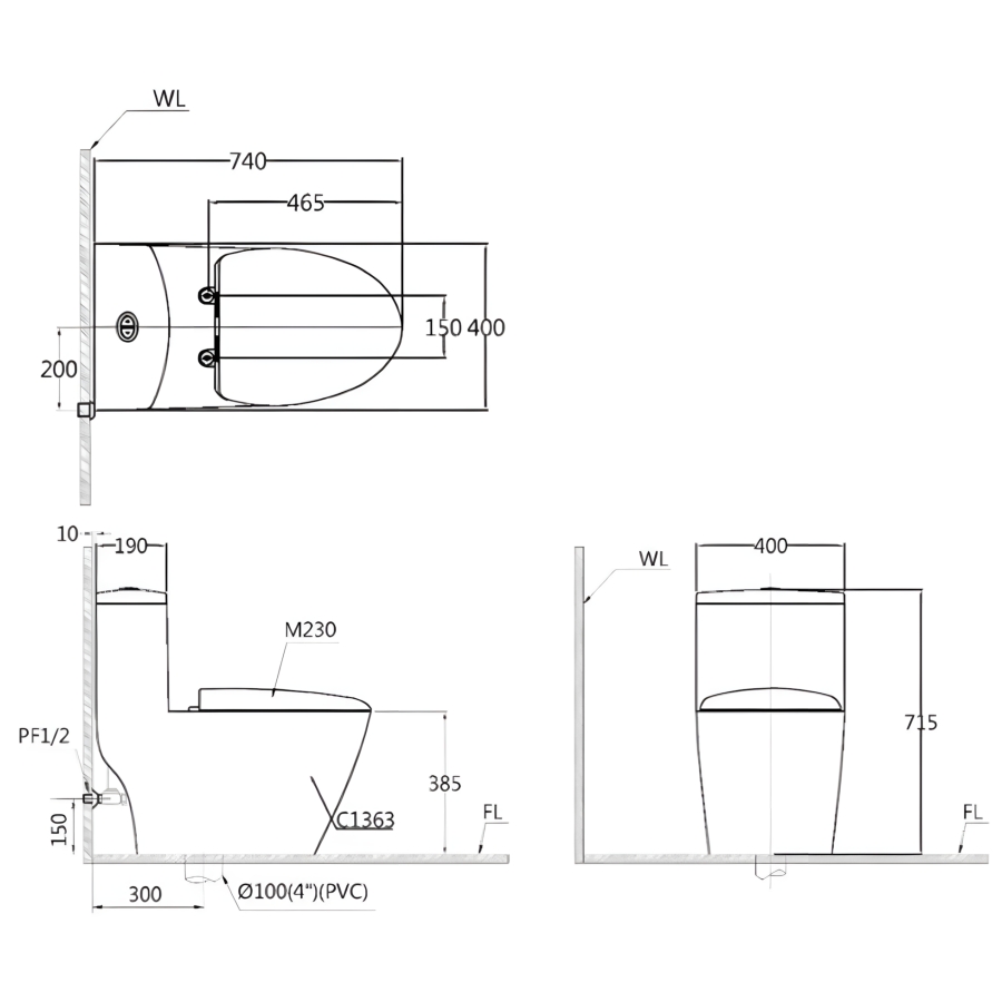 Kích thước bồn cầu: 740 x 400 x 715 mm (Dài x Rộng x Cao)