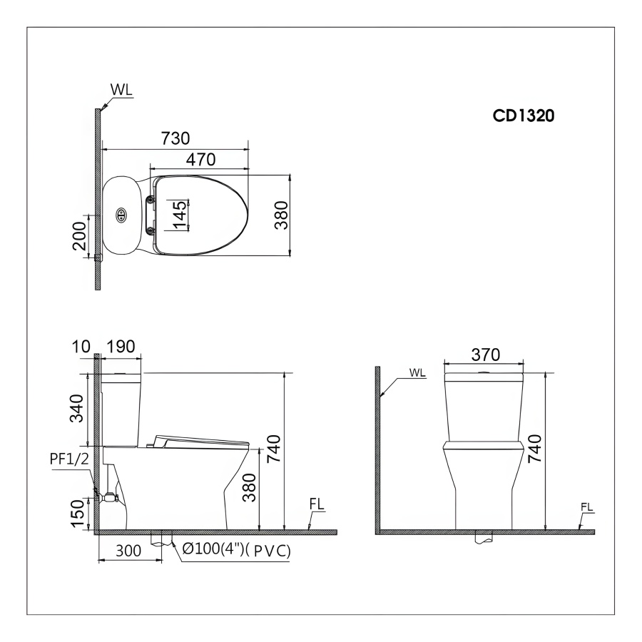 Bản vẽ kích thước bồn cầu nắp rửa điện tử Caesar CD 1320 TAF610H