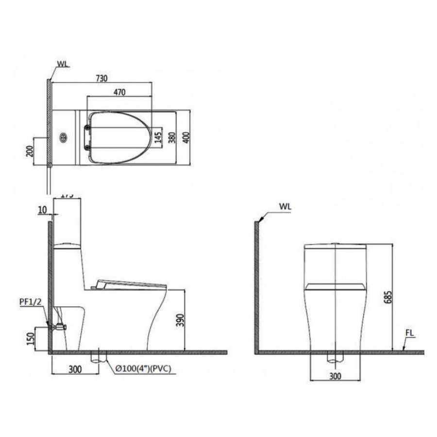Bản vẽ kích thước bồn cầu C1356F nắp rửa TAF512H