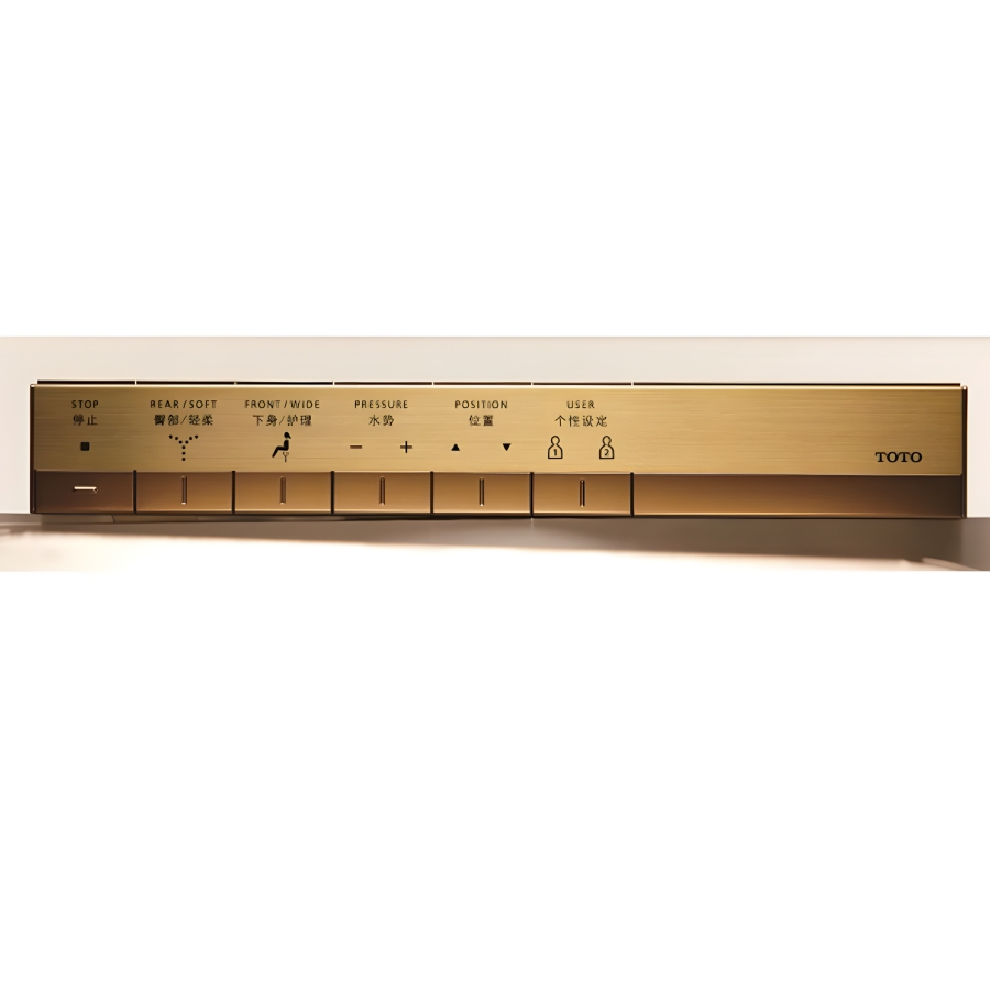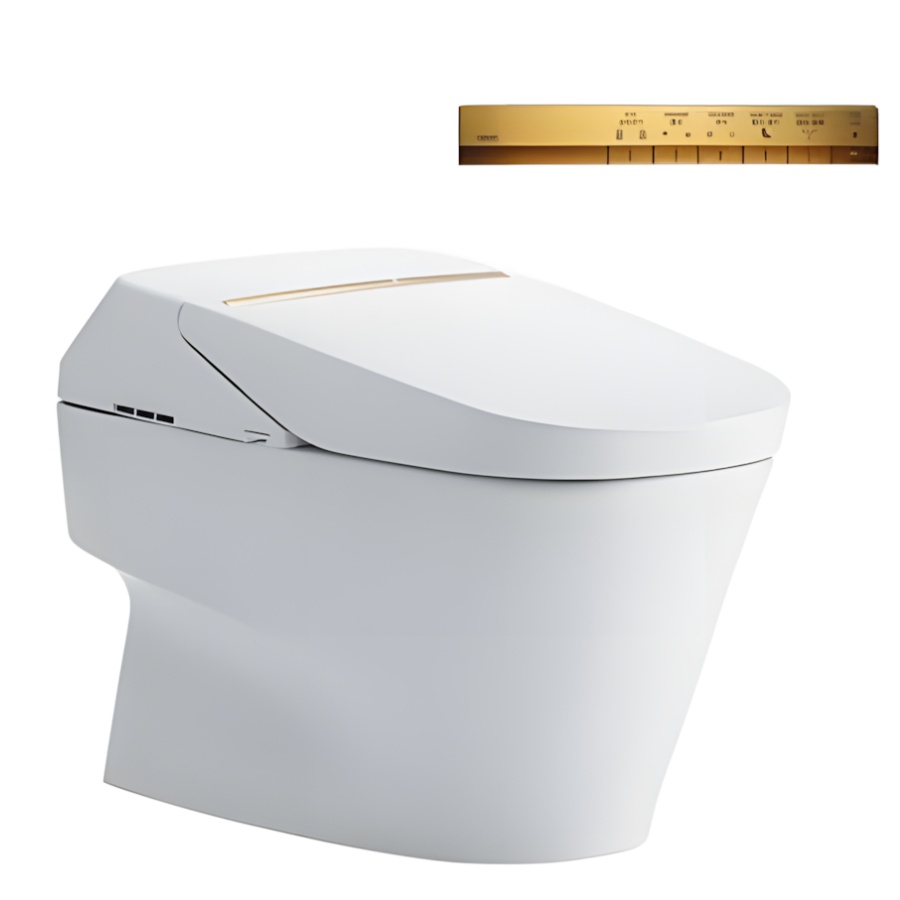 Bảng điều khiển từ xa mạ vàng: Nâng tầm trải nghiệm với bảng điều khiển từ xa mạ vàng sang trọng, cho phép bạn dễ dàng thao tác mọi tính năng thông minh của bồn cầu.