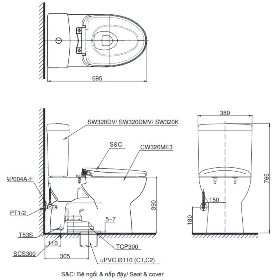 Bản vẽ Bồn Cầu TOTO CS325DRT8 Hai Khối Nắp TC600VS