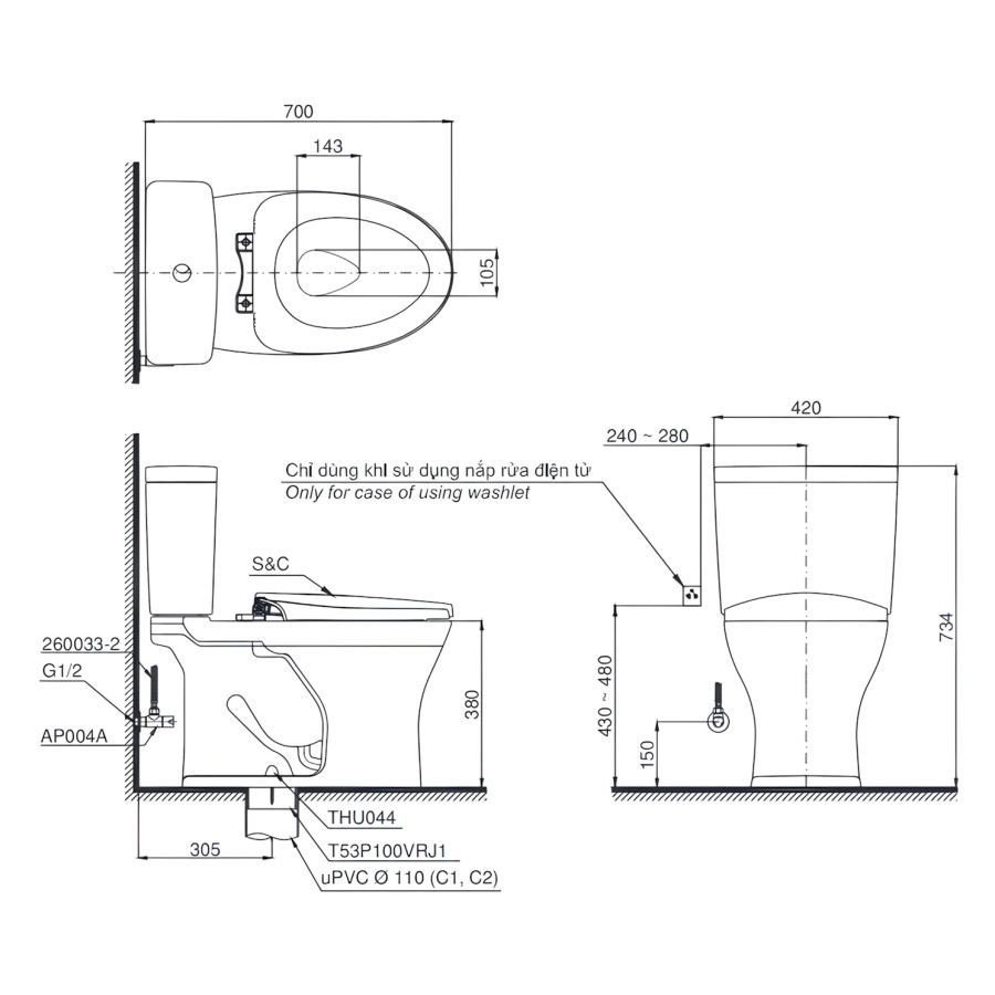 Bản vẽ Bồn Cầu TOTO CS735DT2 Hai Khối Nắp Đóng Êm TC393VS