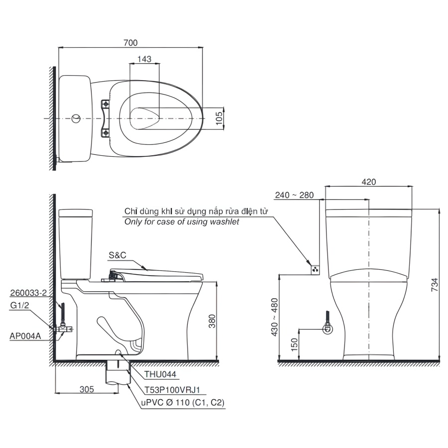 Bản vẽ Bồn Cầu TOTO CS735DW16 Hai Khối Điện Tử Washlet C2 TCF23410AAA