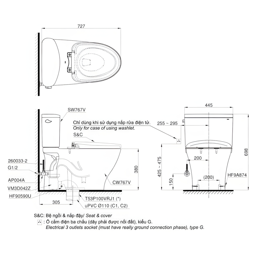 Bản vẽ Bồn Cầu TOTO CS767CRW17 Hai Khối Nắp Điện Tử Washlet C2 TCF23460AAA Giấu Dây