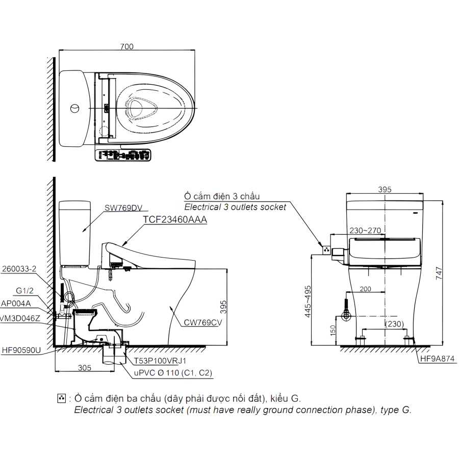 Bản vẽ kích thước bồn cầu điện tử TOTO CS769CDRW17