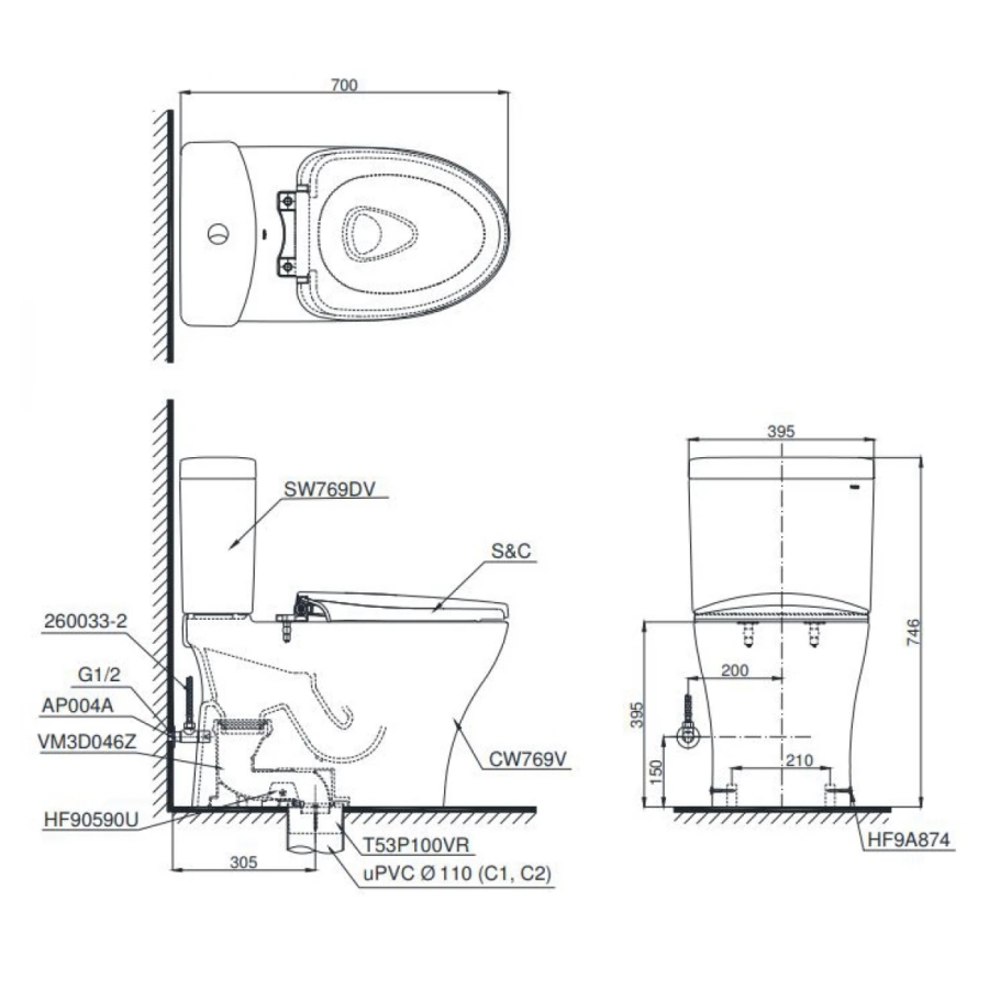 Bản vẽ Bồn Cầu TOTO CS769DRE4 Hai Khối Nắp Rửa Cơ TCW1211A