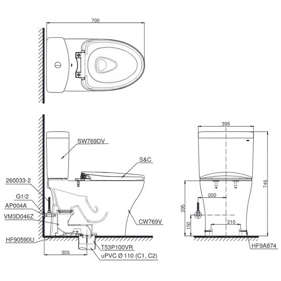 Bản vẽ kích thước bàn cầu TOTO CS769T10