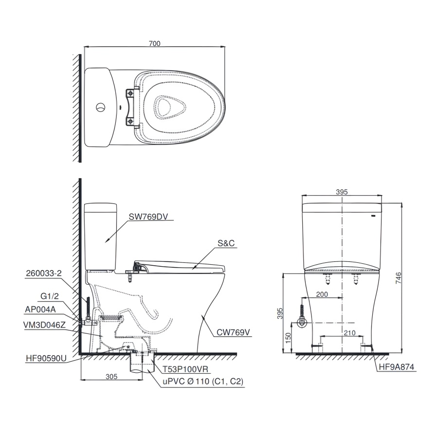 Bản vẽ Bồn Cầu TOTO CS769DRT2 (CS769DT2) Hai Khối Nắp TC393VS