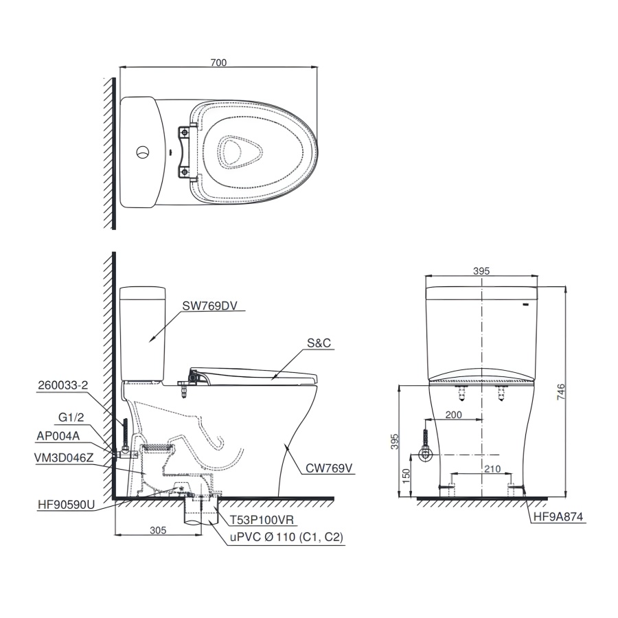 Bản vẽ Bồn Cầu TOTO CS769DRT8 (CS769DT8) Hai Khối Nắp TC600VS