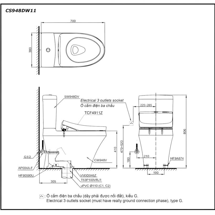 Bản vẽ xí bệt TOTO CS948W11 nắp điện tử TCF4911Z