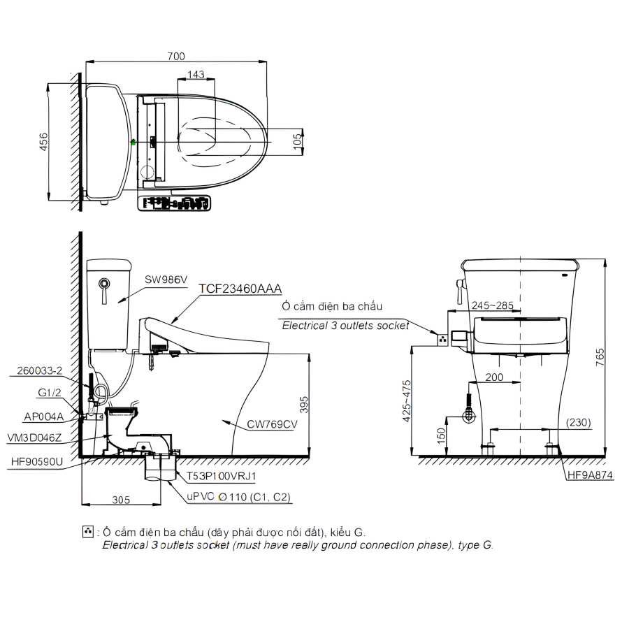 Bản vẽ kích thước bồn cầu điện tử TOTO CS986GW17
