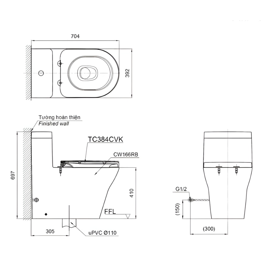 Bản vẽ Bồn Cầu TOTO CW166RB/TC384CVK Một Khối Nắp Êm
