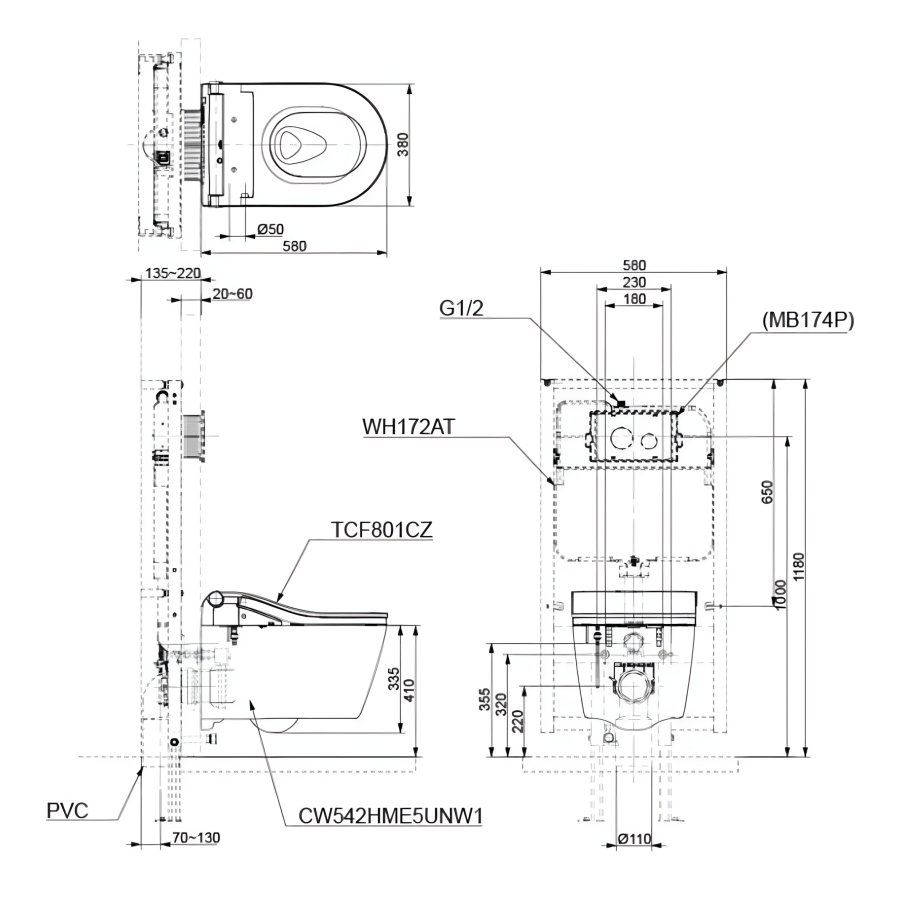 Bộ sản phẩm đồng bộ: Bao gồm thân cầu CW542HME5UNW1 (thay thế mã cũ CW542HME3UNW1), nắp rửa điện tử TCF801CZ, két nước âm tường WH172AT và nút nhấn MB175M#SS, tạo thành một giải pháp hoàn chỉnh, thẩm mỹ và tiện lợi.