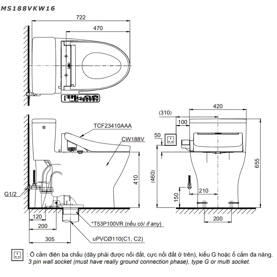 Bản vẽ kích thước bàn cầu điện tử TOTO MS188VKW16 nắp TCF23410AAA