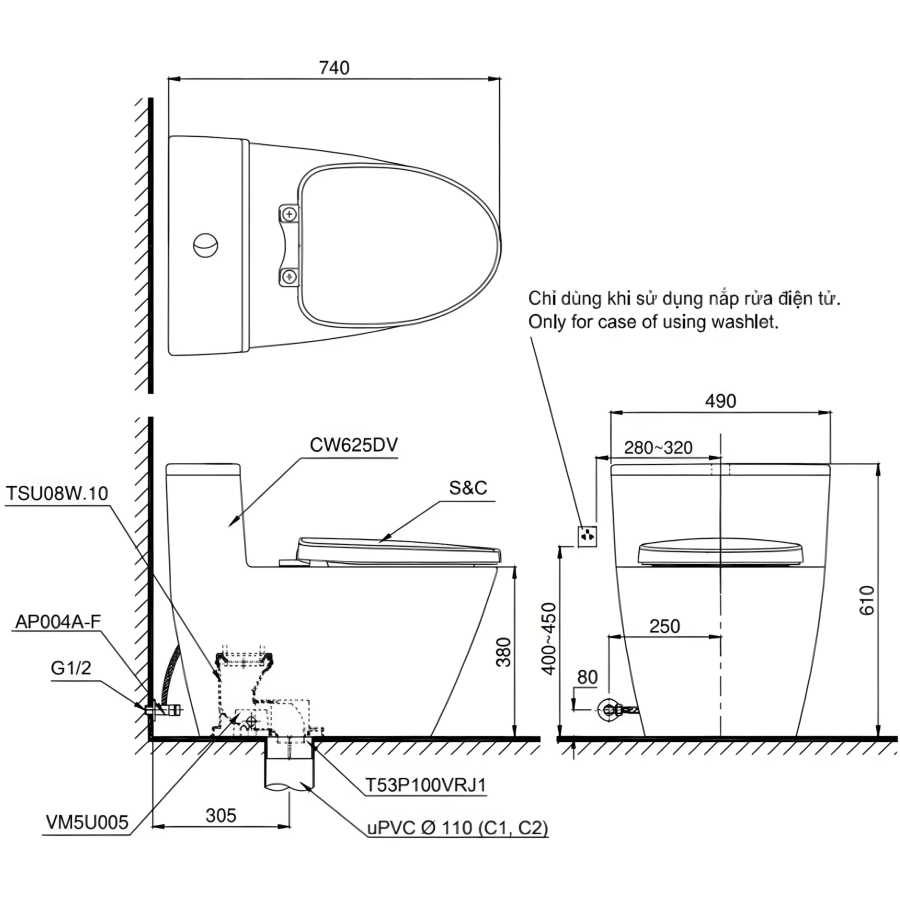 Bản vẽ kích thước bàn cầu nắp rửa cơ TOTO MS625DE4