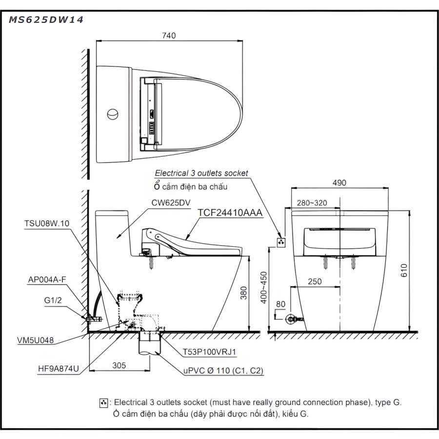 Bản vẽ kích thước bồn cầu Washlet MS625DW14XW TOTO