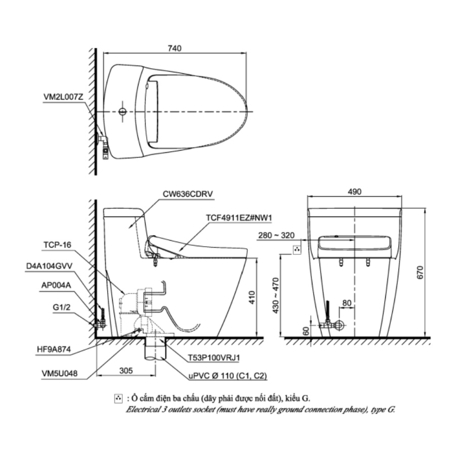Bồn cầu TOTO MS636CDRW12 1 khối nắp điện tử Washlet S7 TCF4911EZ giấu dây