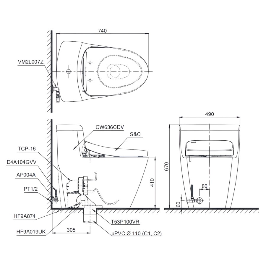 Bản vẽ Bồn Cầu TOTO MS636DT2 1 Khối Nắp TC393VS
