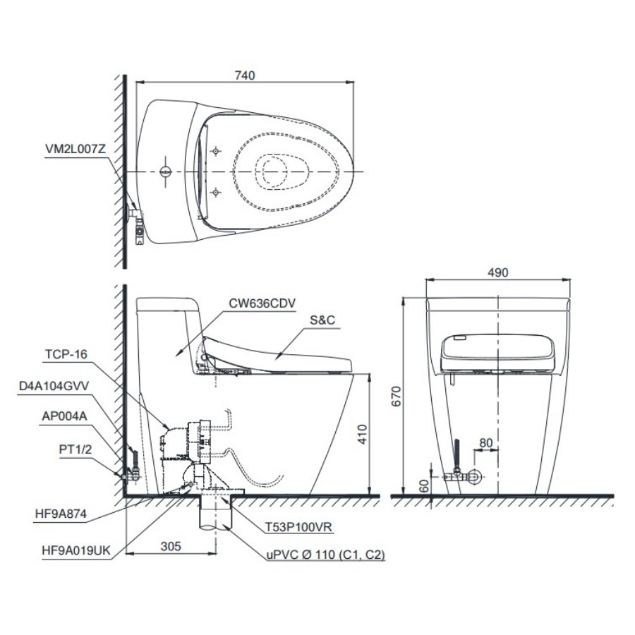 Bản vẽ Bồn Cầu TOTO 1 Khối Nắp TC600VS