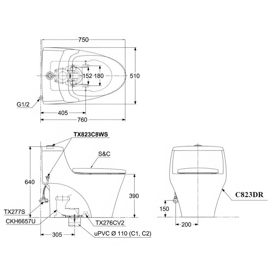 Bản vẽ kích thước bồn cầu liền khối TOTO MS823