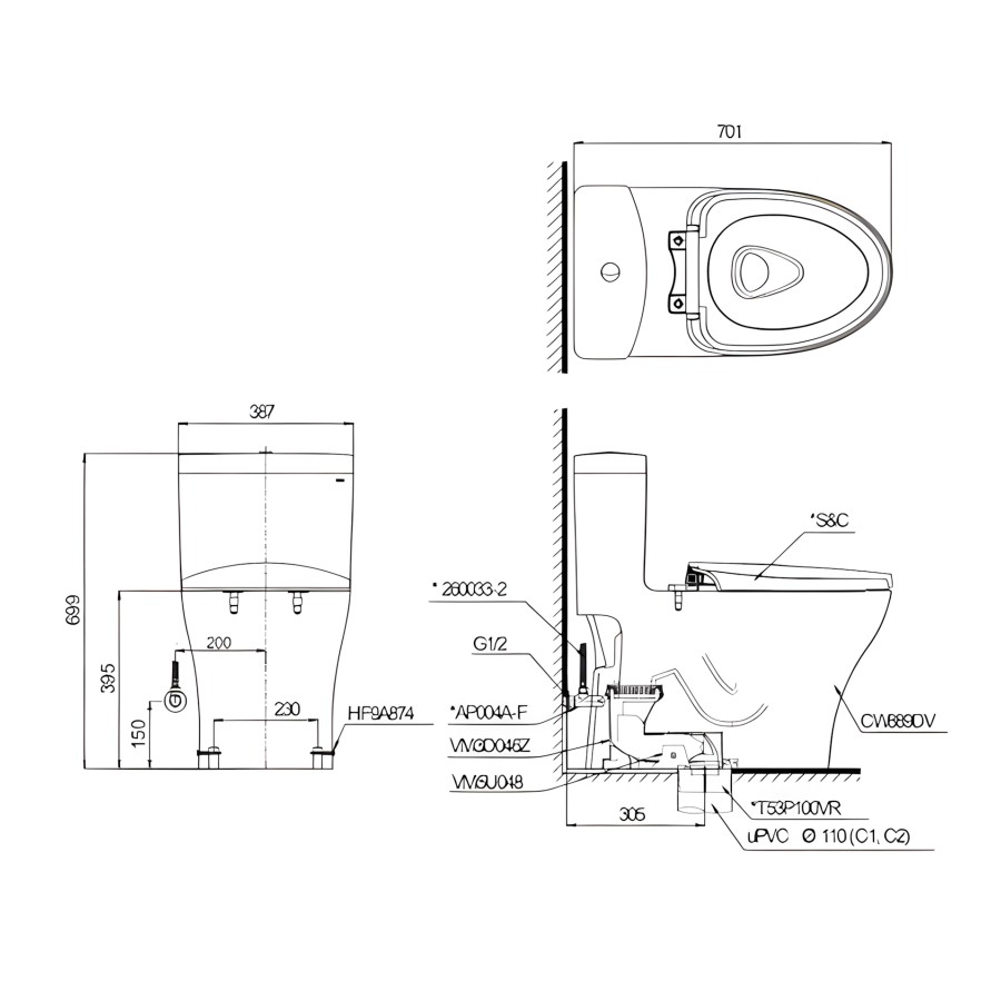 Bản vẽ Bồn Cầu TOTO MS855DT3 Một Khối Nắp TC385VS