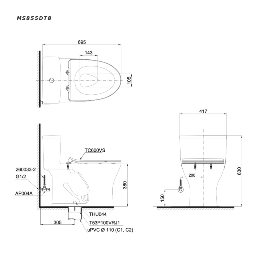 Bao gồm: Thân cầu C855D và Nắp bồn cầu TC600VS
