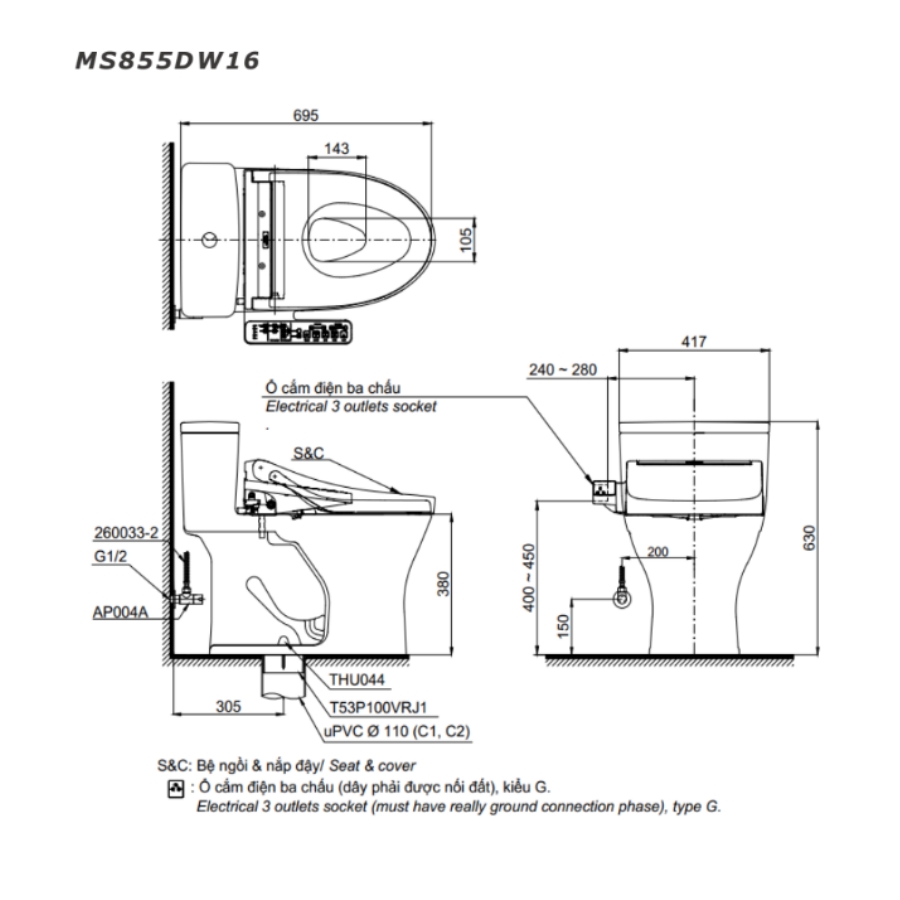 Bản vẽ Bồn Cầu TOTO MS855DW16 Một Khối Nắp Điện Tử Washlet C2 TCF23410AAA