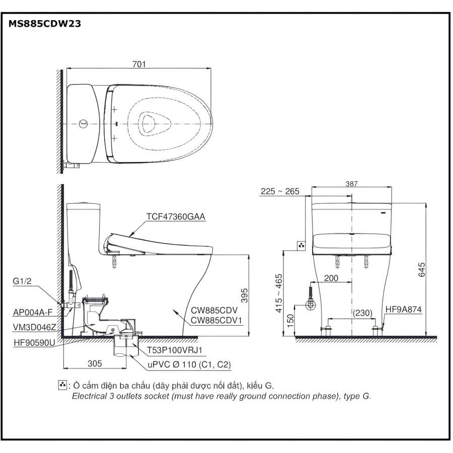 Bản vẽ kích thước bồn cầu Toto MS885W23 kèm Nắp Rửa Điện Tử Washlet S7 TCF47360GAA